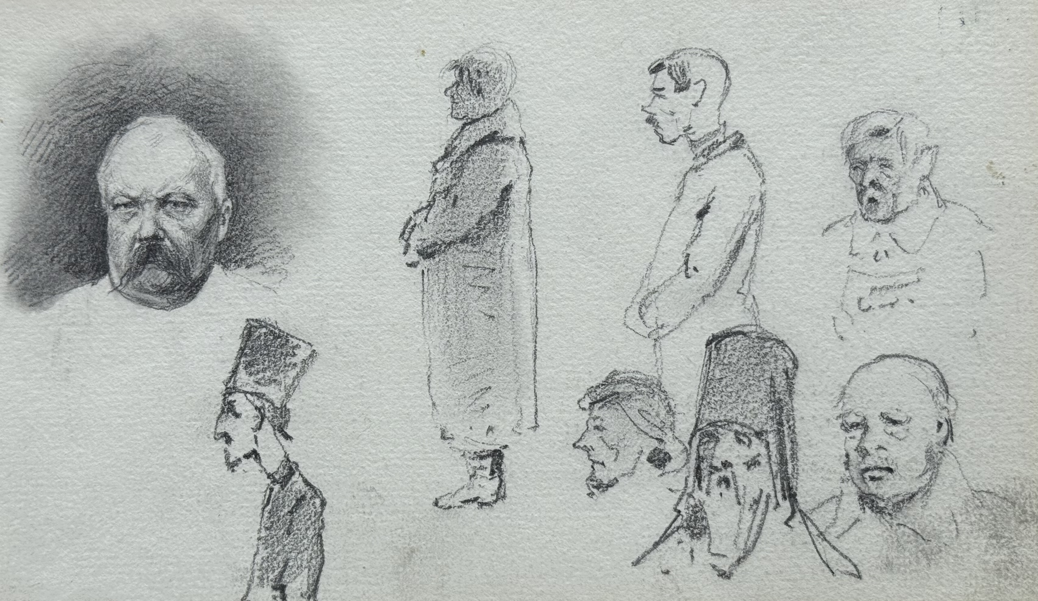 Арк.12. Начерки чоловічих фігур і голівАрк.12. Начерки чоловічих фігур і голівПапір, олівець; 11,4х19,5Sheet 12. Sketches of male figures and headsPaper, pencil; 11.4 × 19.5 cm