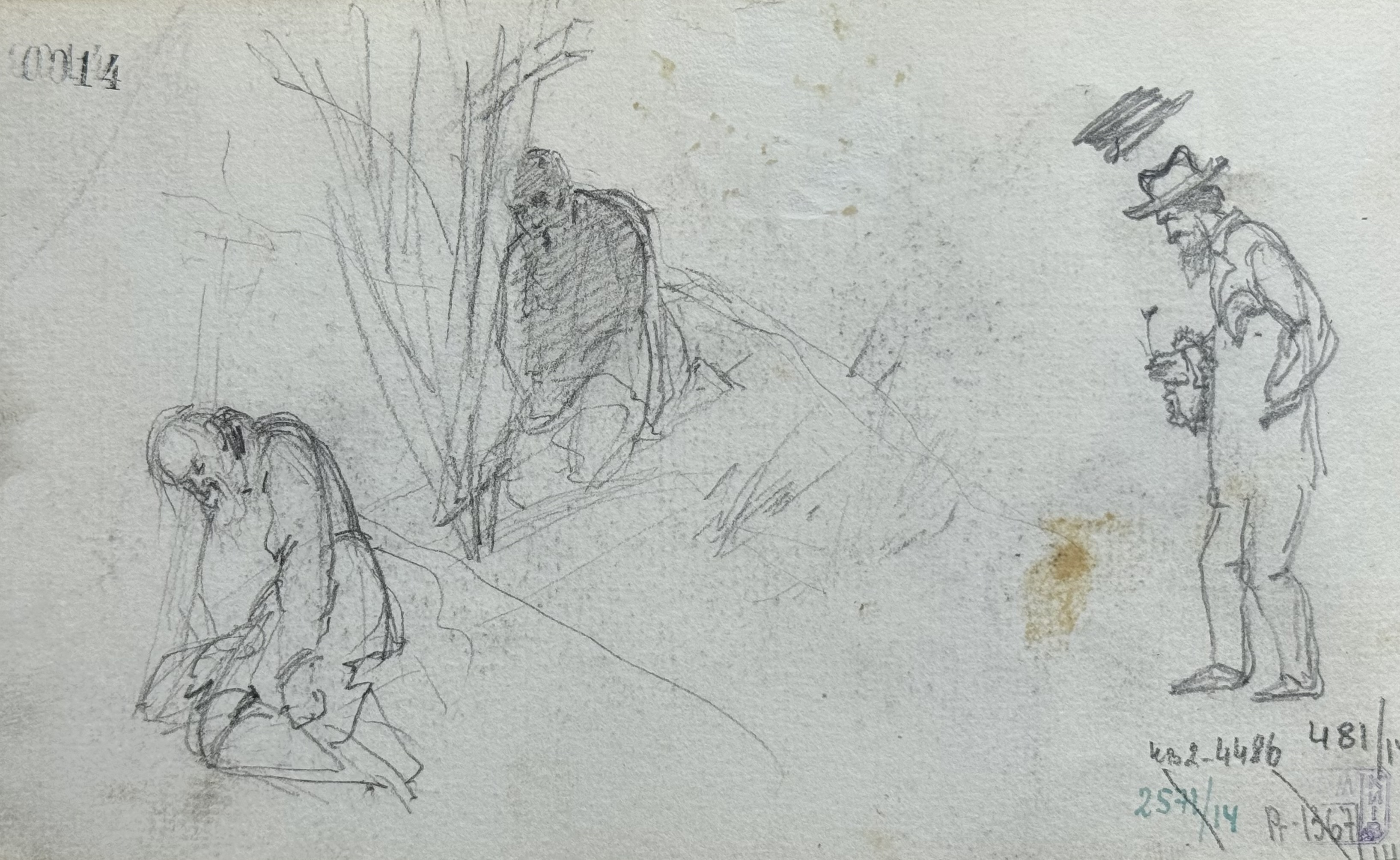 Арк.14 (на звороті). Начерки трьох чоловічих фігурАрк.14 (на звороті). Начерки трьох чоловічих фігурПапір, олівець; 11,4х19,5Sheet 14 (reverse). Sketches of three male figuresPaper, pencil; 11.4 × 19.5 cm