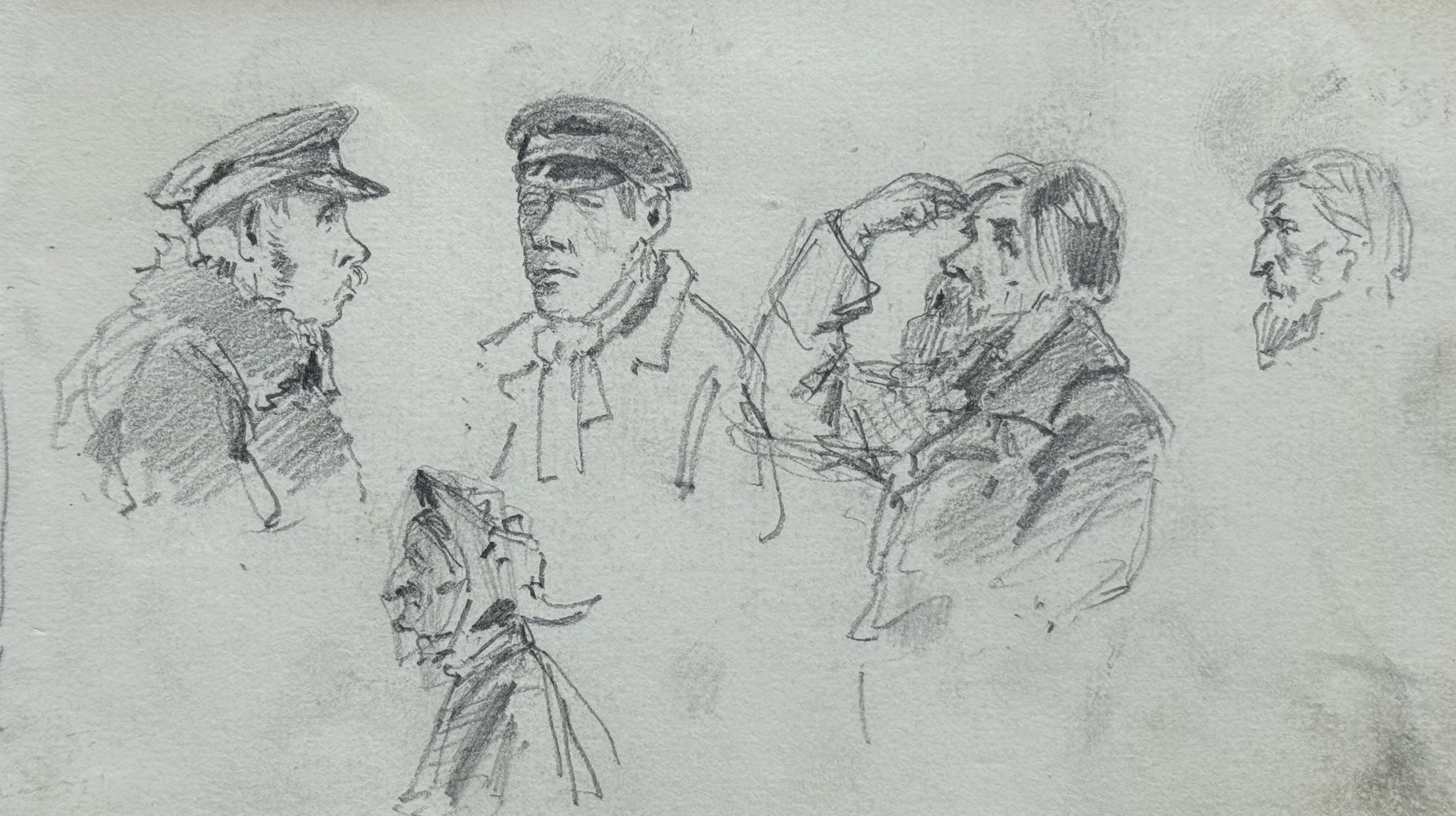 Арк.14. Начерки чоловічих та жіночої фігурАрк.14. Начерки чоловічих та жіночої фігур, голови чоловікаПапір, олівець; 11,4х19,5Sheet 14. Sketches of male and female figures, man’s headPaper, pencil; 11.4 × 19.5 cm