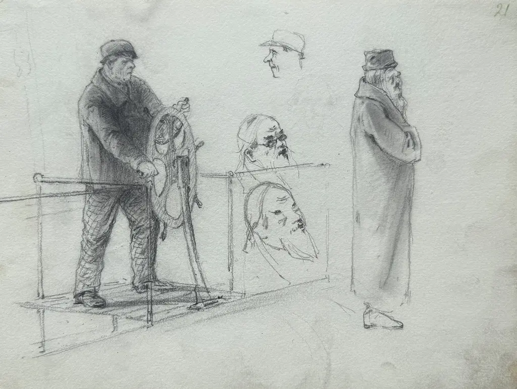 Арк.20. Чоловік за штурваломАрк.20. Чоловік за штурвалом; начерки трьох чоловічих голів; фігура старого у довгому одязіПапір, олівець; 20х26Sheet 20. Man at a helm; sketches of three male heads; figure of an old man in a long robePaper, pencil; 20 x 26 cm