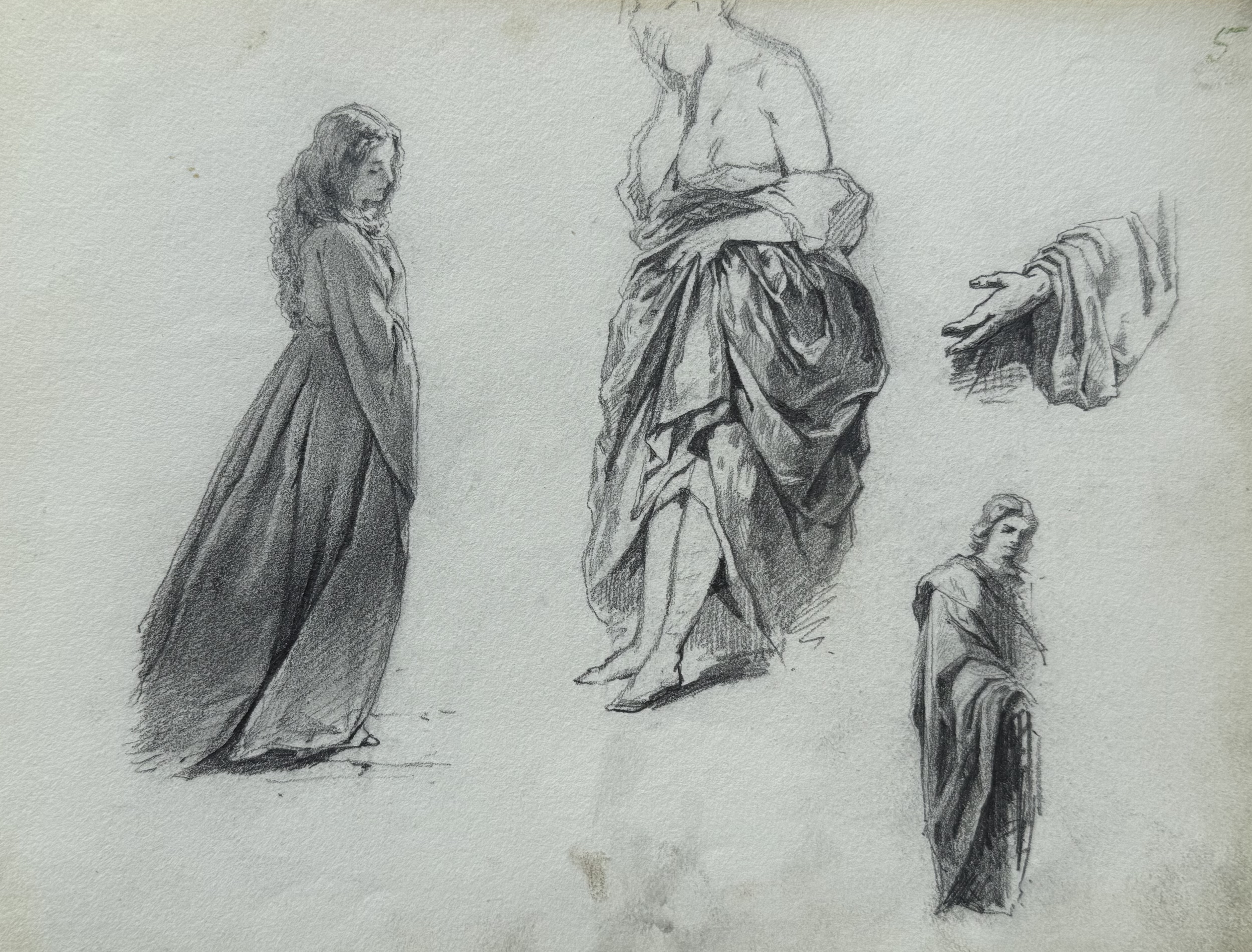 Арк.5. Жіночі фігури в одязі з драпіруваннямАрк.5. Жіночі фігури в одязі з драпіруванням; рука під драпіровкоюПапір, олівець; 20х26Sheet 5. Female figures in draped clothing; hand under drapery Paper, pencil; 20 x 26 cm