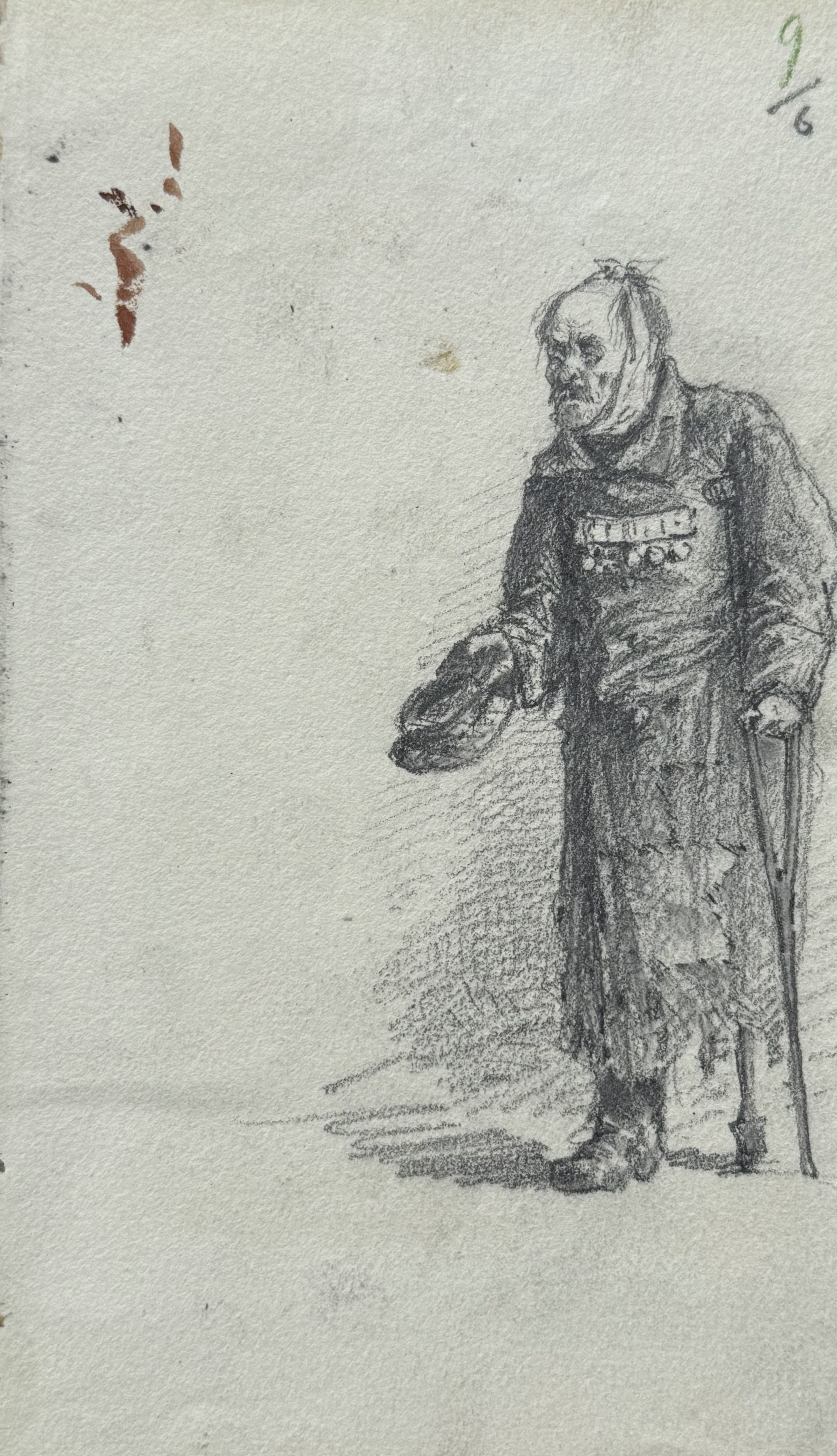 Арк.9 (відрізаний з правого боку). Жебрак (солдат-інвалід)Арк.9 (відрізаний з правого боку). Жебрак (солдат-інвалід)Папір, олівець; 20х11,5Sheet 9 (cut off on the right side). Beggar (disabled soldier)Paper, pencil; 20 x 11.5 cm