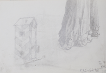 Арк. 13 (на звороті). Начерки драпіровки спідниці з двома оборками та будки сторожа. Етюди до картини Біля Литовського замку