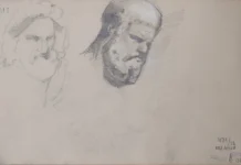 SheeАрк.10. Чоловічі голови та фігури; дитина, яка спить (начерки)