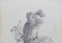 Арк.6. Візник, який просить милостиню. Унизу напис: Старому ямщичку на чаекъ