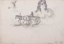 Арк. 13 (на звороті). Кінь, що везе віз. Напис: «Огурец. Зелень». (Огірок. Зелень). Угорі праворуч погрудне зображення оголеної жінки. Ліворуч – чортик, що летить...