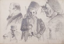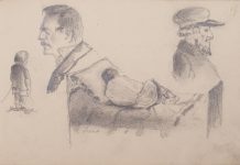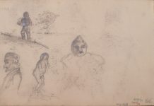 Арк. 17. Чоловік, який спить; дві чоловічі голови, фігура дитини (начерки)
