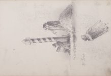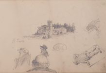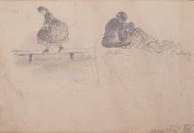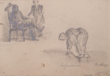 Арк. 12 (на звороті). Начерк жінки в криноліні, яка йде через місток. Напис: «Стрельня». 12 серп. … Дві фігури селян (начерк). Напис: «Нева». 17...