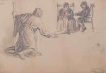 Арк. 9 (на звороті). Фігура чоловіка в довгому одязі, який стоїть навколішки; дві фігури, що сидять у кріслі (начерки)