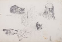 Sheet. 5. Two Male Heads; a Hand; a Sleeping Cat (sketches)