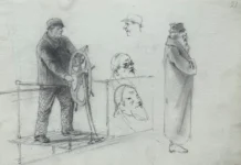 Арк.20. Чоловік за штурвалом; начерки трьох чоловічих голів; фігура старого у довгому одязі